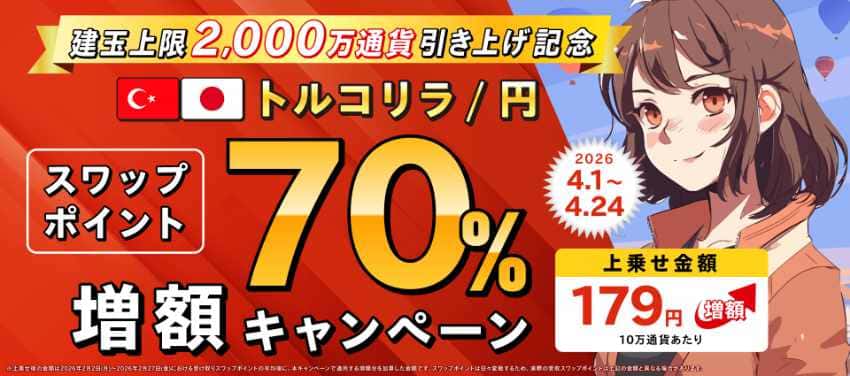 | 証拠金の目安 (TRY/JPY=3.653円の場合) | 1,000通貨(0.1Lot):146円 10,000通貨(1Lot):1,463円 |